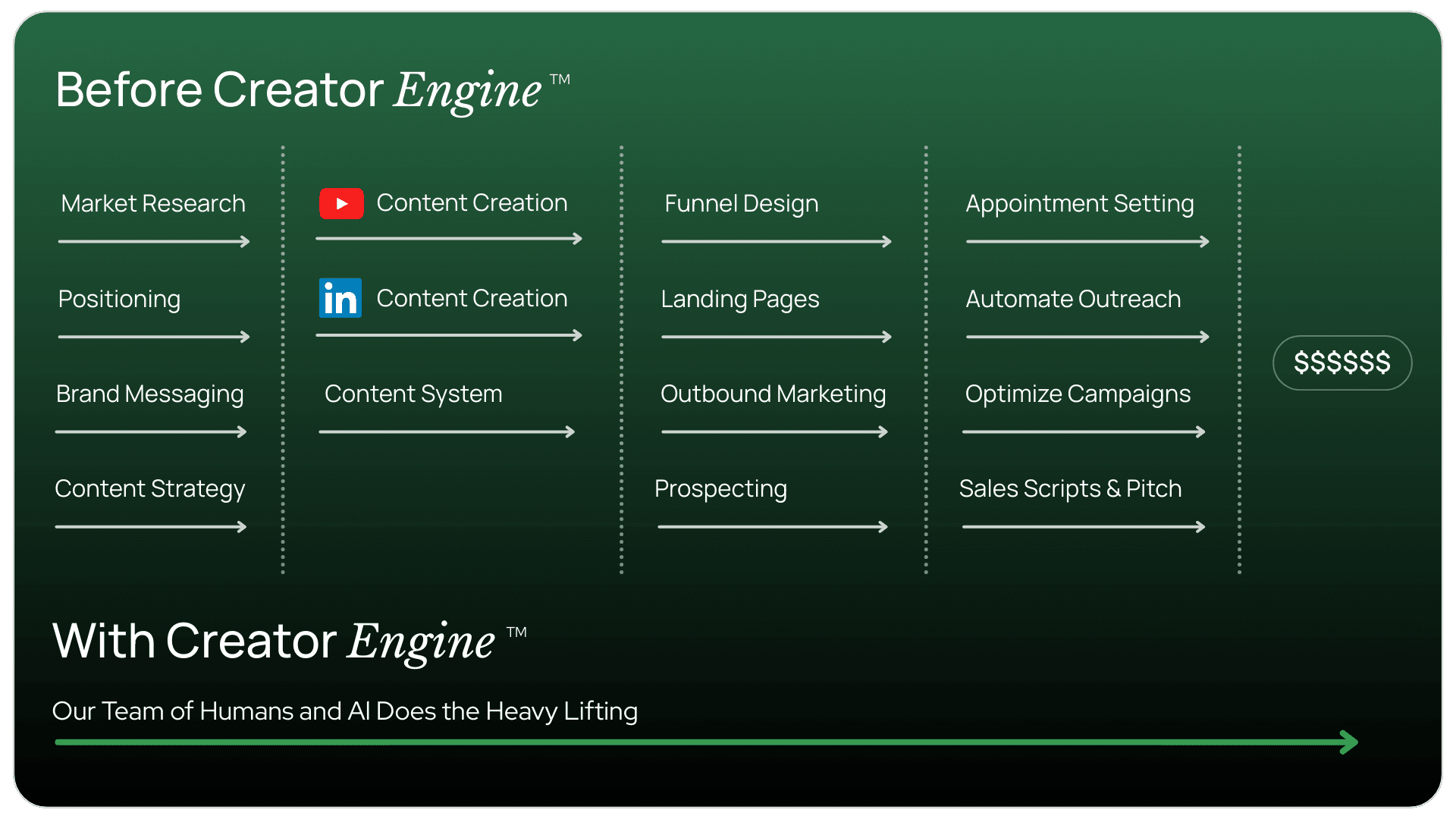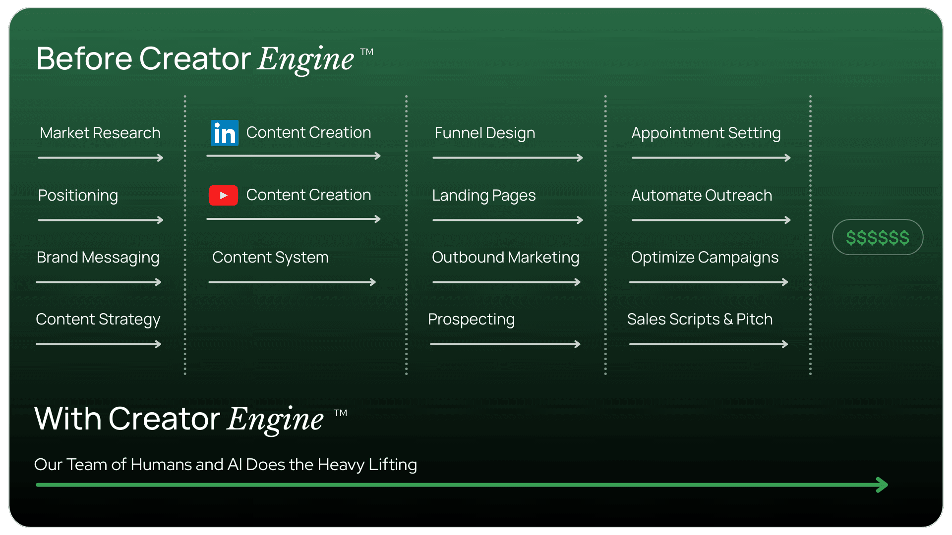 We’re not just another content service — we’re a growth system. Creator Engine combines human expertise with AI to scale your presence on YouTube and LinkedIn, turning attention into revenue without adding hours to your workload.